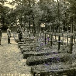 1. Trzech żołnierzy austro-węgierskich przy nagrobkach poległych kolegów na cmentarzu w Kielcach, 1917 r. fot. Jan Ziembiński
