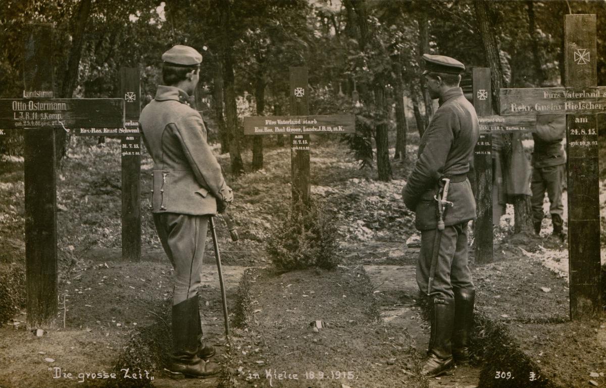 2. Dwóch podoficerów niemieckich wśród mogił na cmentarzu w Kielcach, 1915, fot. Jan Ziembiński