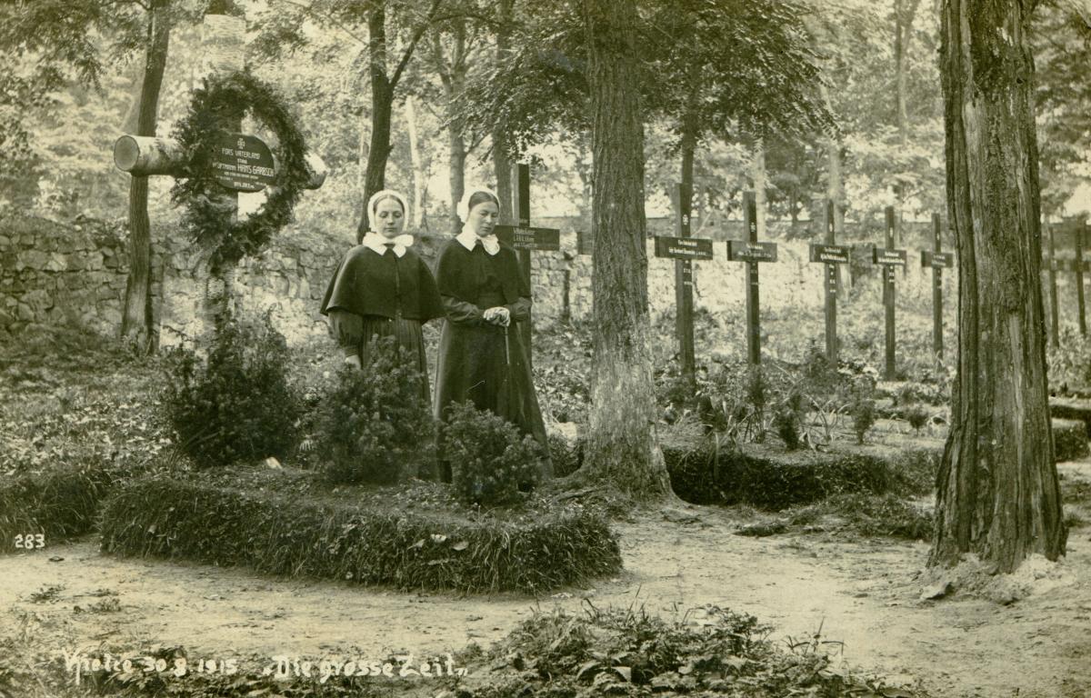 3. Dwie siostry żeńskiego diakonatu kościoła luterańskiego przy nagrobkach żołnierzy niemieckich na cmentarzu ewangelickim w Kielcach, 1915 r. fot. Jan Ziembiński